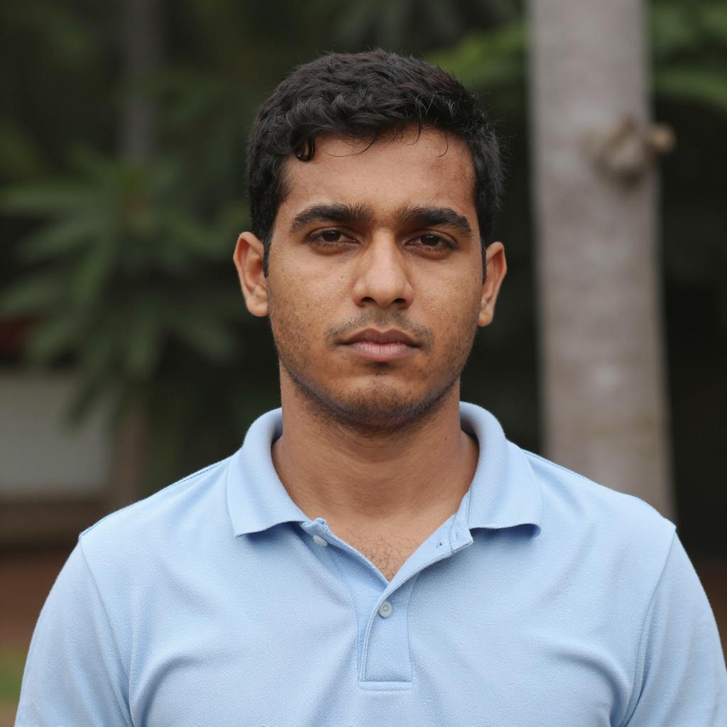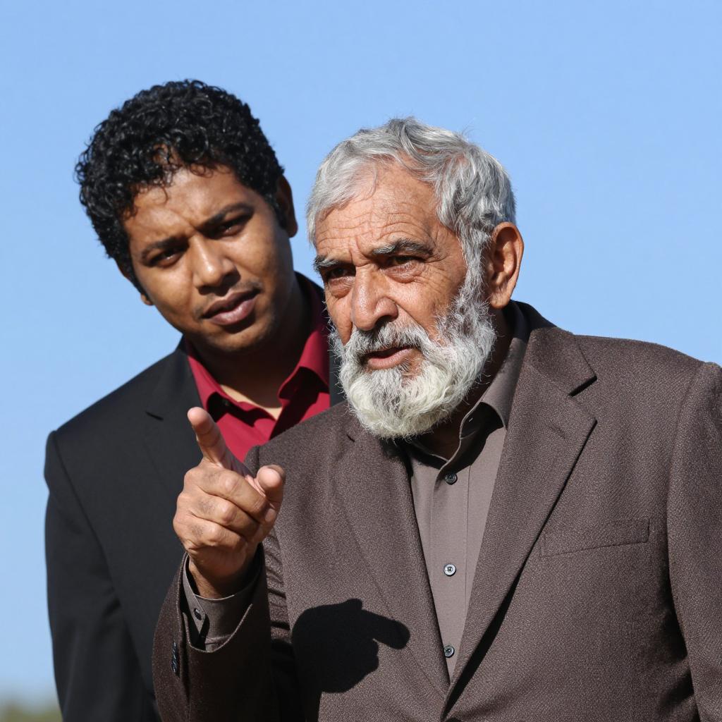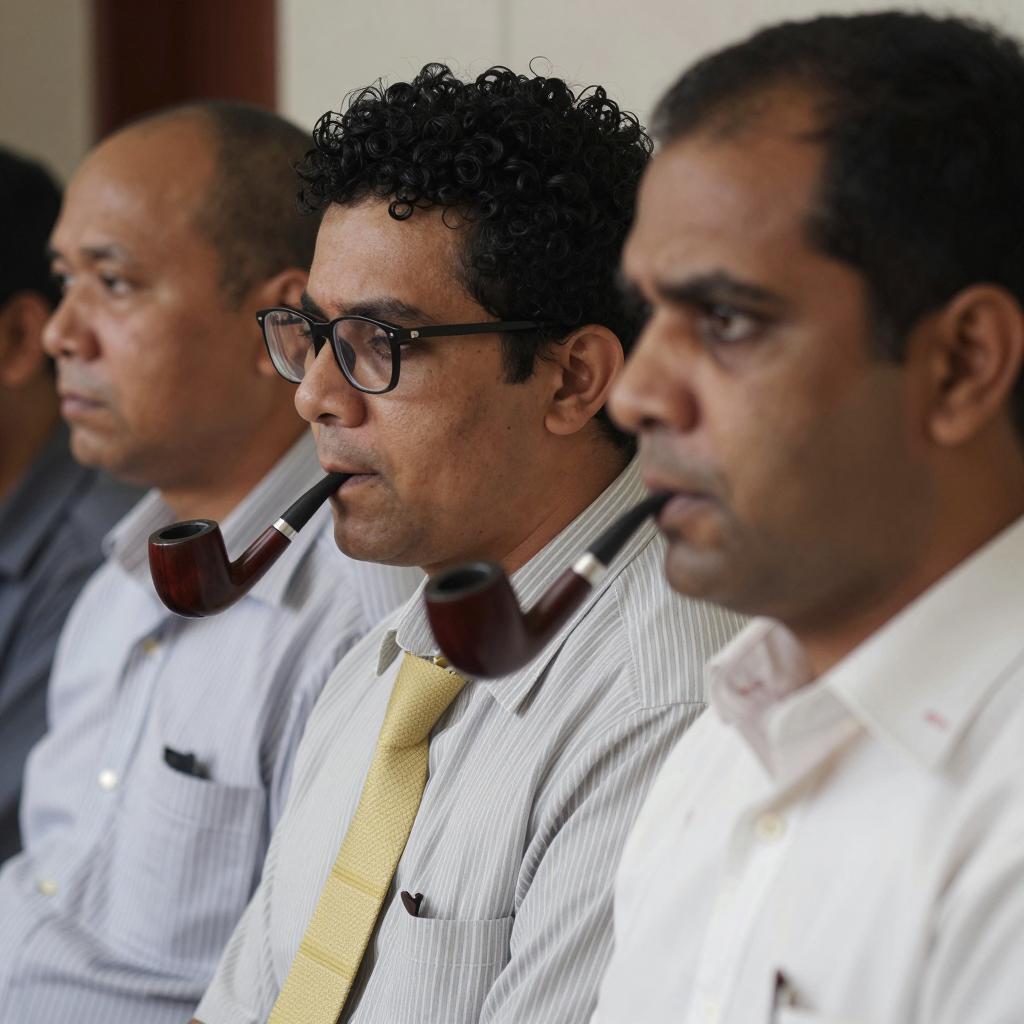 Two men indoors. Foreground man with dark curly hair, striped blue and brown shirt, and black sleeves, looks down, hands open. Background man with balding head, blue shirt, and chest hair, looks at foreground man. Background is blurred, light-colored wall. Foreground man's expression is focused, background man's expression is neutral.