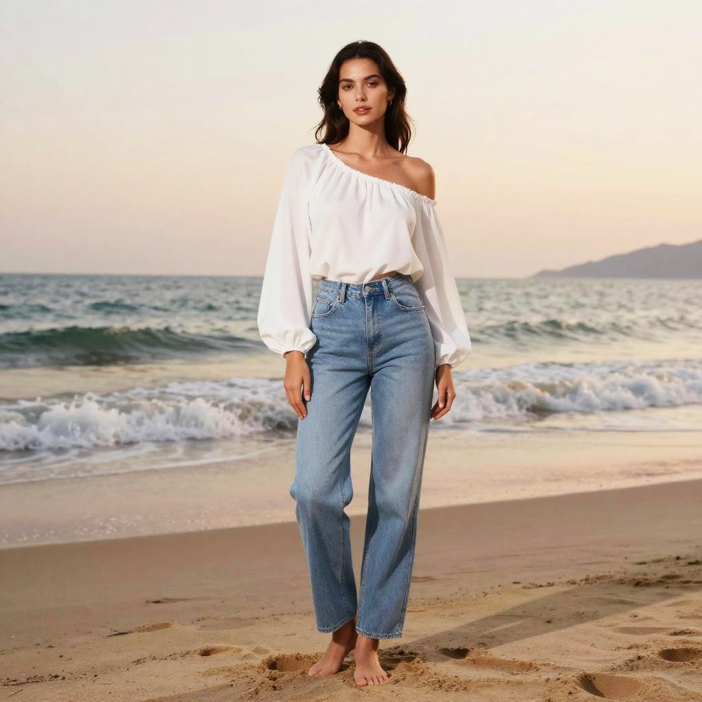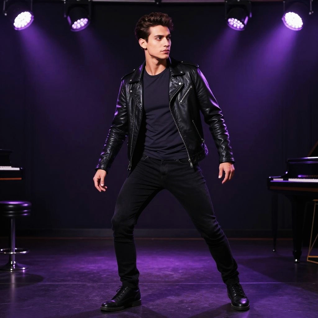 Young man in urban graffiti-covered alley in the evening, wearing black bomber jacket with white graphic tee, ripped jeans, warm golden hour lighting with soft shadow play, relaxed stance, sharp focus, high detail, vibrant blues against muted grays, clean environment, minimalist styling, no logos, balanced composition with negative space, natural skin tones, SDXL photoreal look, warm color grading, no text