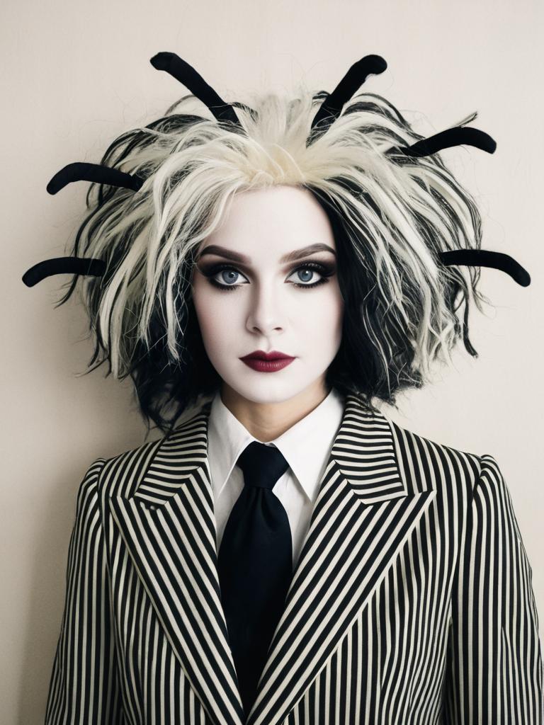 Ladies Beetlejuice Wig, dressed as a beetle beetle with a black and white striped suit --sref 1390