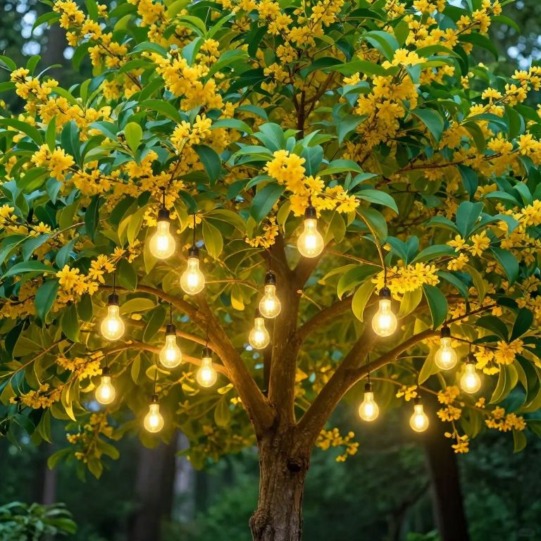 A photograph of a lush tree adorned with bright yellow flowers and hanging incandescent light bulbs. The tree's green leaves contrast vividly with the yellow blossoms and warm glow of the lights. The bulbs are evenly spaced along the branches, casting a soft, ambient light. The background is a dark, forested area, creating a serene and enchanting atmosphere. The texture of the tree bark is visible, adding a natural, rustic element to the scene. The image captures a blend of natural beauty and gentle artificial lighting, creating a magical, almost whimsical effect.