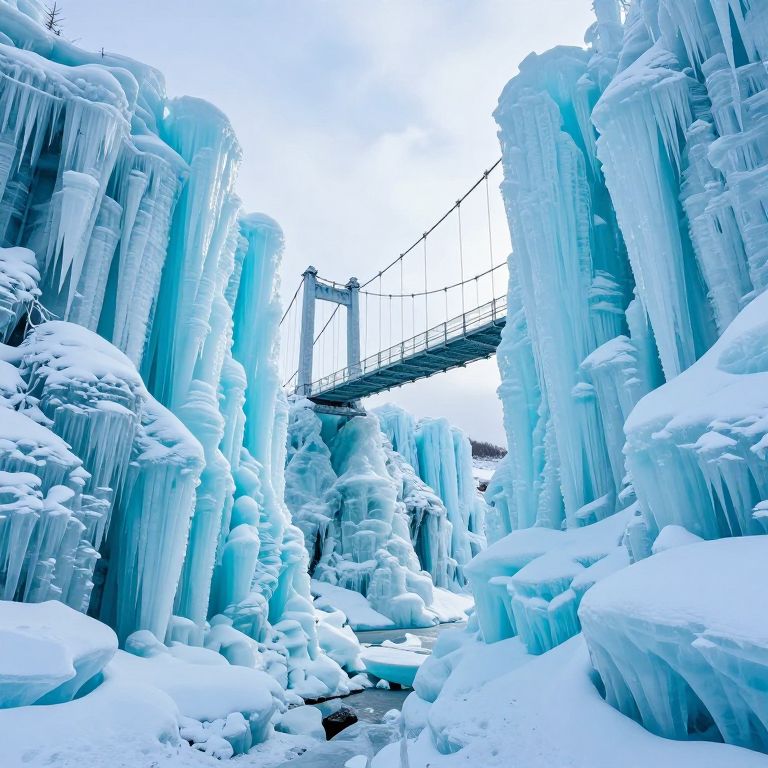 A suspension bridge spans a chasm between towering ice formations, their jagged peaks and cascading icicles glowing with an otherworldly turquoise light, as if carved from the crystalline dreams of a forgotten winter.