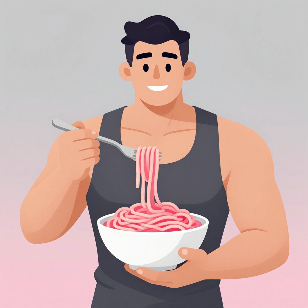 A muscular cartoon man holds a bowl of pink spaghetti, with a simple, airbrushed background of grey and pink.
