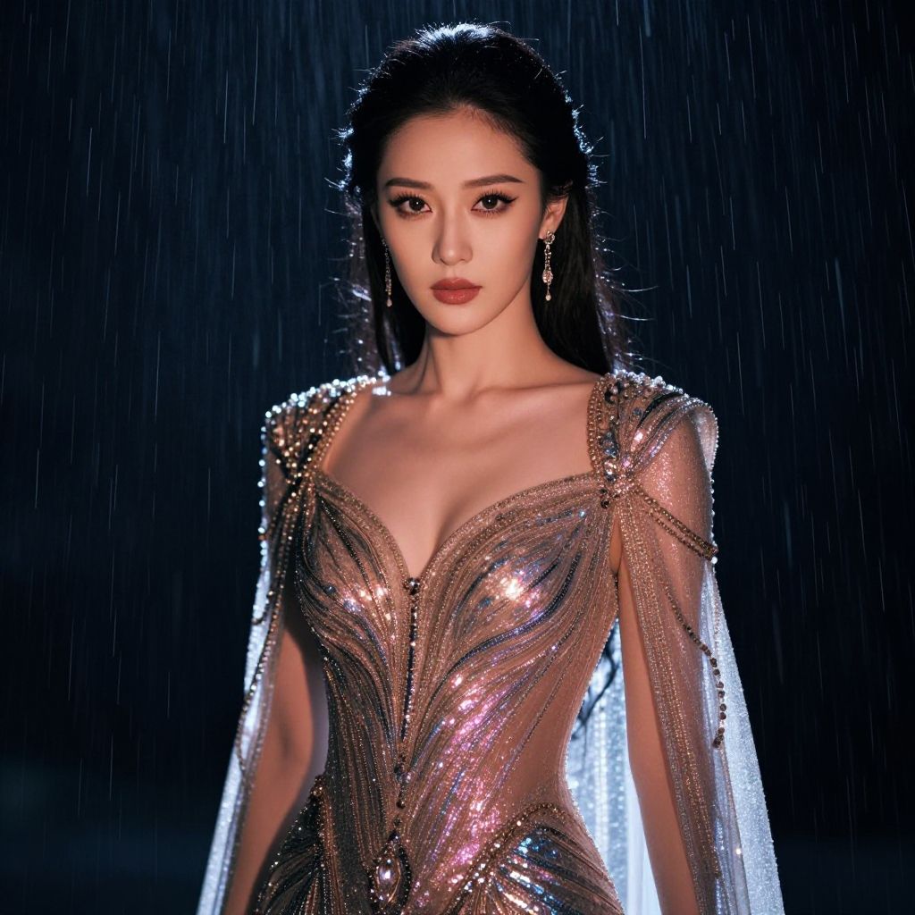 A cinematic shot of a mysterious woman in her early 30s with sharp, elegant features, high cheekbones, and dark wavy hair styled with a crown, wearing a luxurious tiger fancy dress with intricate embroidery, tiger print sleeves and a detailed face mask, standing in a dimly lit traditional Chinese temple courtyard at night with lanterns glowing in the distance.. The woman has big tits and cute face
