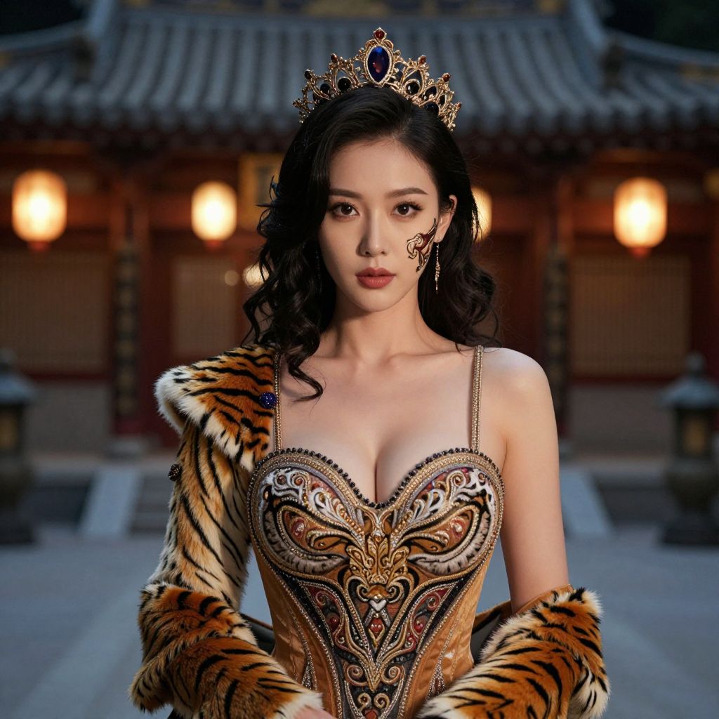 Photograph of an Asian woman with fair skin and long, wavy black hair. She wears an ornate, low-cut, tiger-patterned corset dress with intricate gold embroidery and matching tiger fur armlets. A gold tiara with a dark gem adorns her head. Her makeup is subtle, focusing on her eyes and lips. The background features a traditional Asian building with warm, glowing lanterns and a tiled roof. The overall style is regal and elegant, evoking a fantasy or historical royal theme. The woman's confident, direct gaze adds to her commanding presence.