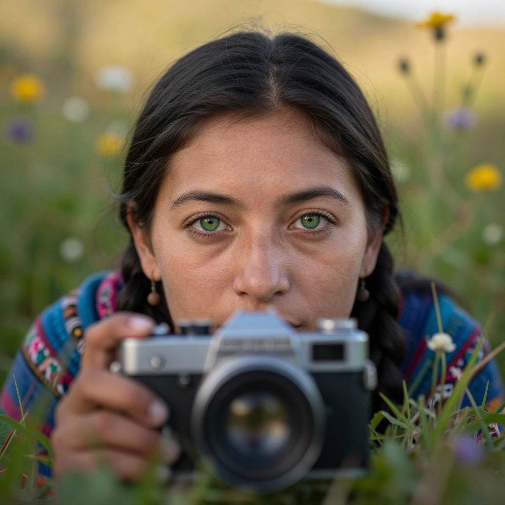 Craft a photorealistic portrait reminiscent of fine art photography, featuring an Andean woman with captivating green eyes. Capture her enigmatic gaze from a unique perspective, as if through an antique camera's lens placed on the ground, evoking a sense of curiosity and introspection. Bathe this intimate scene in soft golden hour light, contrasting her fair complexion against a dreamy bokeh backdrop of lush greenery and wildflowers. Convey both serenity and mystery within this captivating portrait.