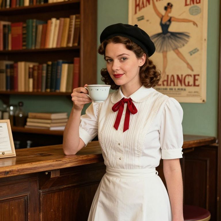 A cinematic portrait of a 1930s café waitress in a timeless French uniform—off-white dress with pleats, a red ribbon tied at the neck, and a tiny beret—standing at a rustic wooden counter in a charming Lyon-style café, her face glowing with natural light, warm brown hair swept to one side, holding a small porcelain cup, the background filled with vintage books, painted walls, and French posters of ballet dancers.