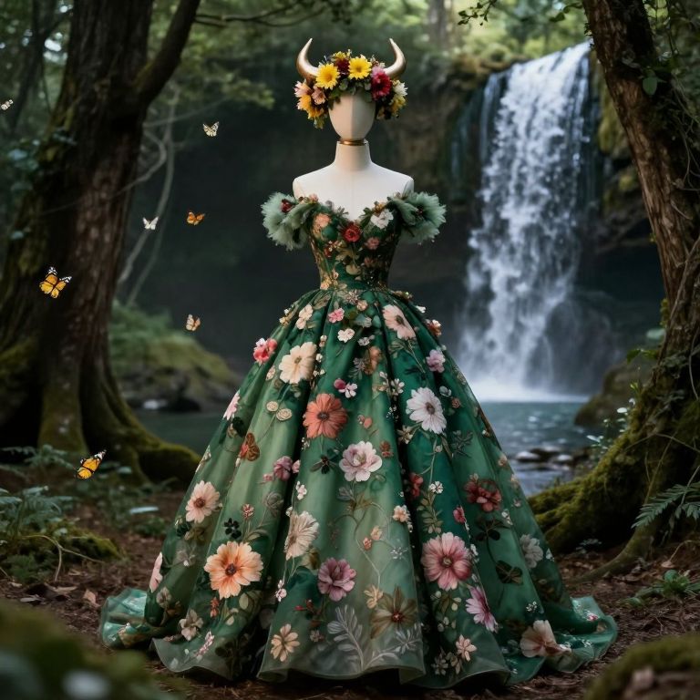 In this captivating image, a Taurus-inspired gown, adorned with intricate floral patterns and a lush green base, dominates the scene. The gown, a symbol of the earth sign, is complemented by a crown of vibrant flowers, adding a touch of spring to the composition. The figure, resembling a mannequin, stands in a forested setting, with trees and a waterfall creating a serene backdrop. The lighting is cinematic, with a soft glow illuminating the scene, enhancing the photo-realistic and gothic elements. Butterflies flutter around, adding a whimsical touch to the fantasy art piece. The overall composition is balanced, with the gown and its floral details taking center stage, surrounded by the natural beauty of the forest.