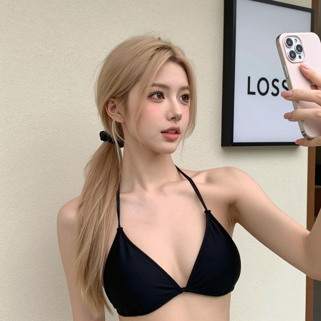 A young woman with long blonde hair in a ponytail, wearing a black bikini top, taking a selfie outdoors near a textured wall and a framed sign, soft natural lighting, clean realistic style, warm tones
