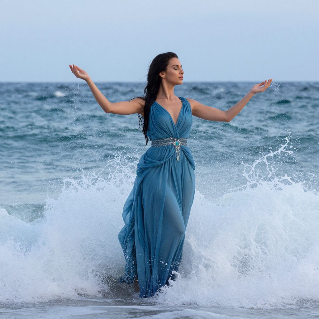 Ethereal woman in flowing azure gown stands amidst crashing waves, her arms outstretched as water droplets shimmer around her, creating a mystical interplay between nature and grace.