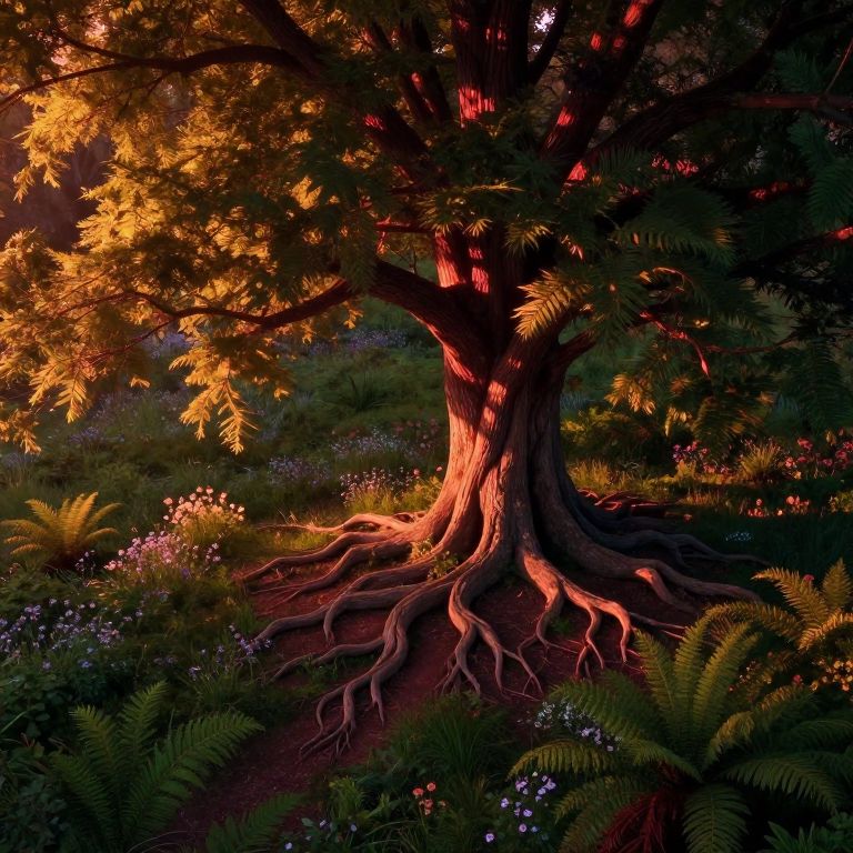 Digital artwork of a glowing, purple-lit tree at the center of a vibrant, multicolored garden with various flowers and foliage.