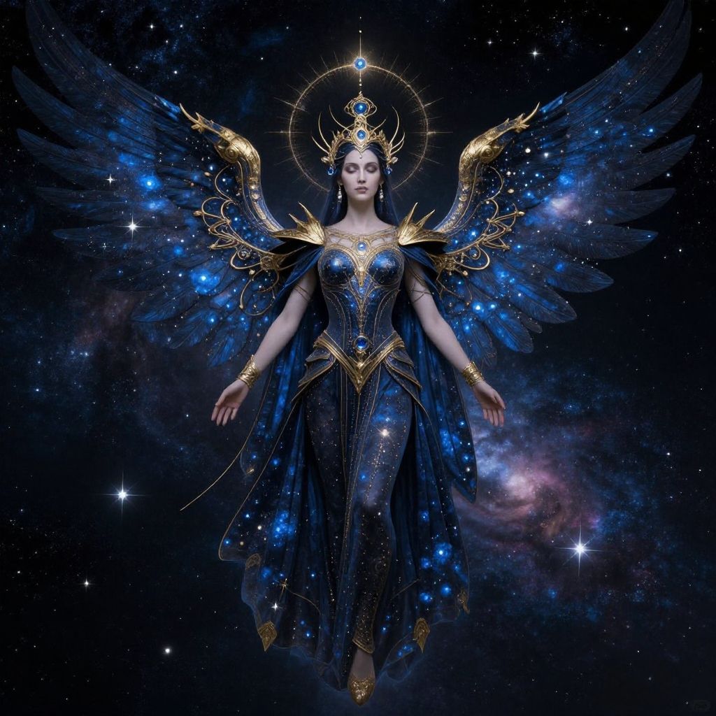 Madana portrayed as a celestial being with radiant wings, hovering above a serene lake under a starry night sky, surrounded by twinkling stars and mystical runes, digital painting with soft lighting and dreamy ambiance