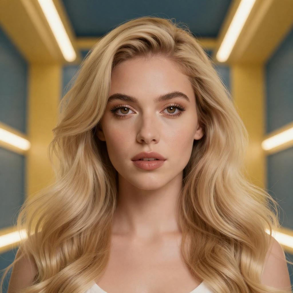 Photograph of a woman with blonde, voluminous hair, intense blue eyes, and full lips. She has dramatic black eye makeup. Background features glowing, abstract yellow and orange hues with metallic patterns above her head. Close-up, frontal view.