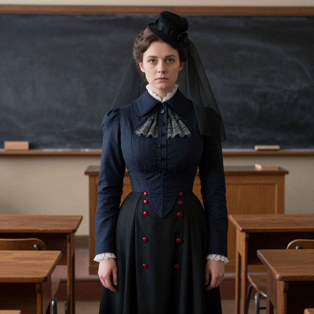 Victorian-era woman in black dress with red buttons, lace collar, and veil stands in classroom with wooden desks and chalkboard.
