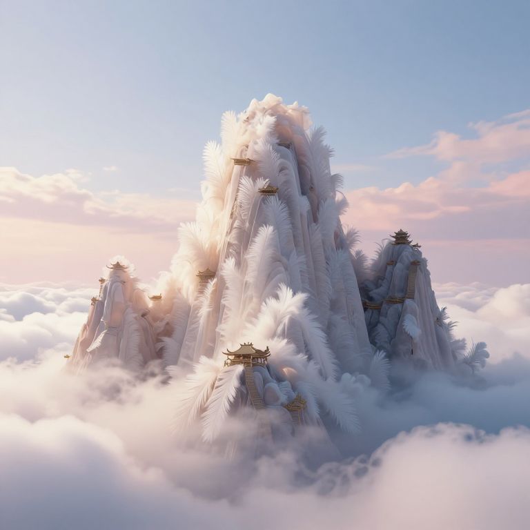 A surreal 3D-rendered mountain composed of ethereal, feather-like structures pierces through a dreamy sky, evoking the whispers of ancient civilizations and the softness of clouds below, captured in high-definition detail.