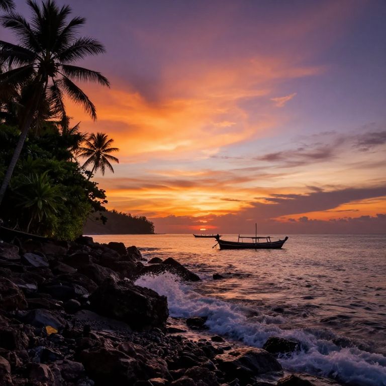 Photograph of a vibrant sunset over a rocky shoreline with a traditional wooden boat silhouetted against orange and purple skies, palm trees on the left