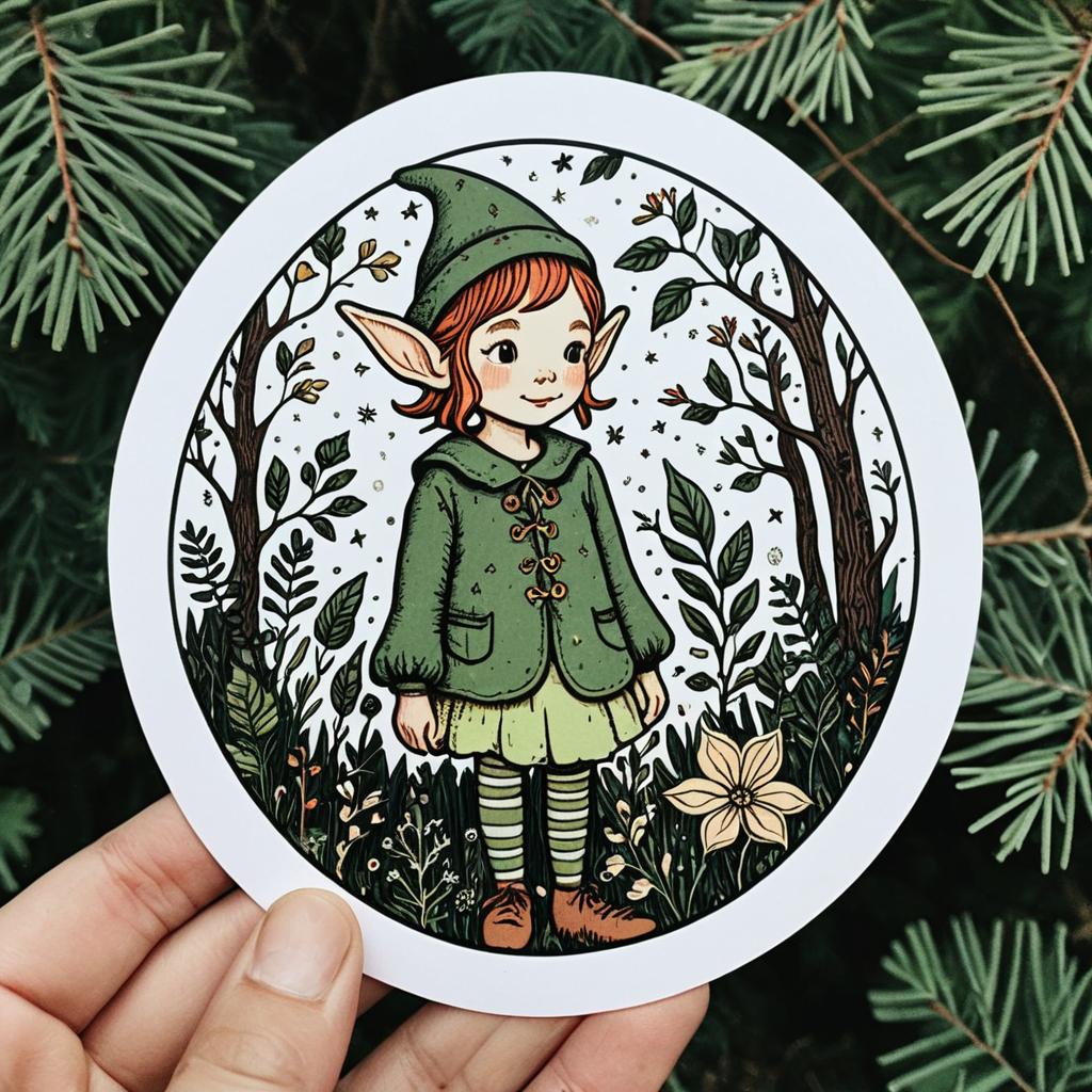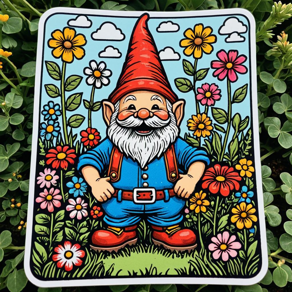 A jubilant garden gnome in a sticker naive art style, with bold outlines, bright garden flowers, creating a whimsical and approachable aesthetic.