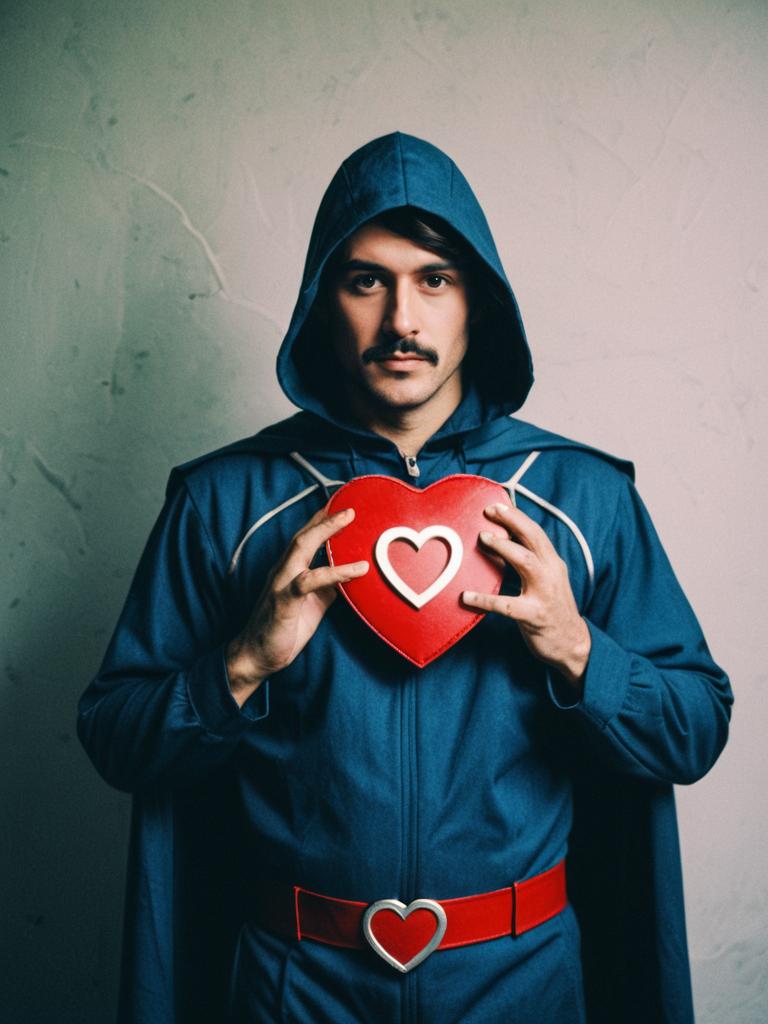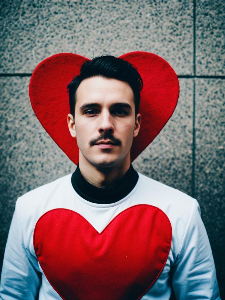 Man in Heart Shaped Love Symbol costume, cosplay editorial portrait, realistic tones