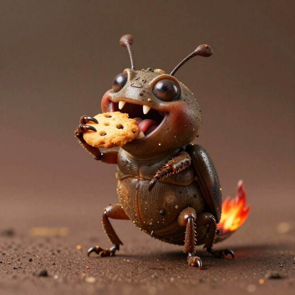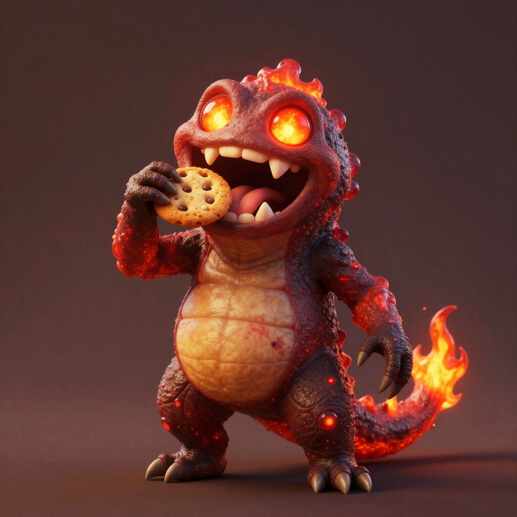 Full body, creature, solo, forest nymph beast, standing, looking at viewer, emerald blue eyes, holding food, cookie, eating, open mouth, fangs, teeth, flame-tipped tail, claws, smile, happy, blush, tongue, scar, straight-on, brown background