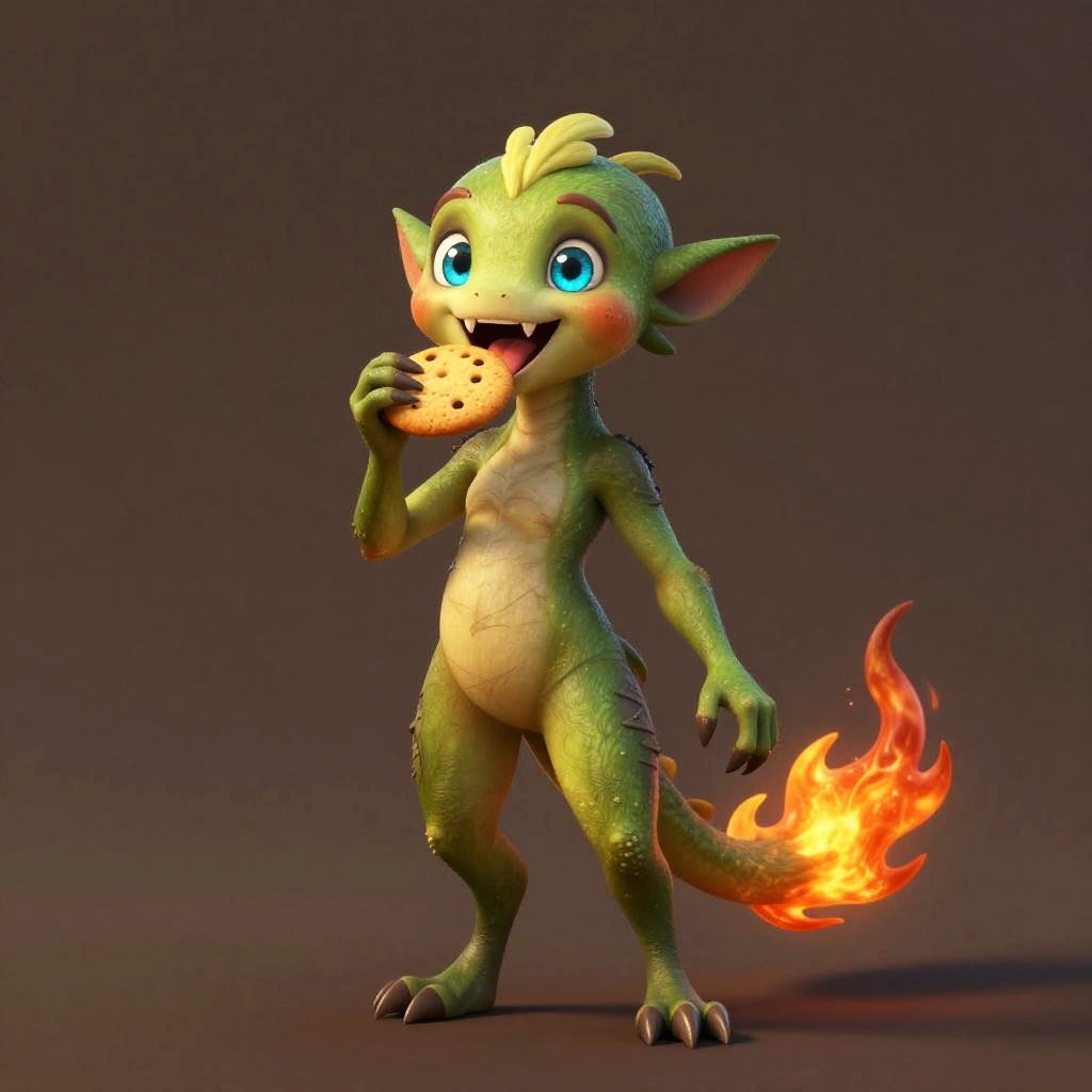 CGI cartoon of a cute, green, furry creature with blue eyes, fiery tail, eating a cookie; standing against a brown gradient background.