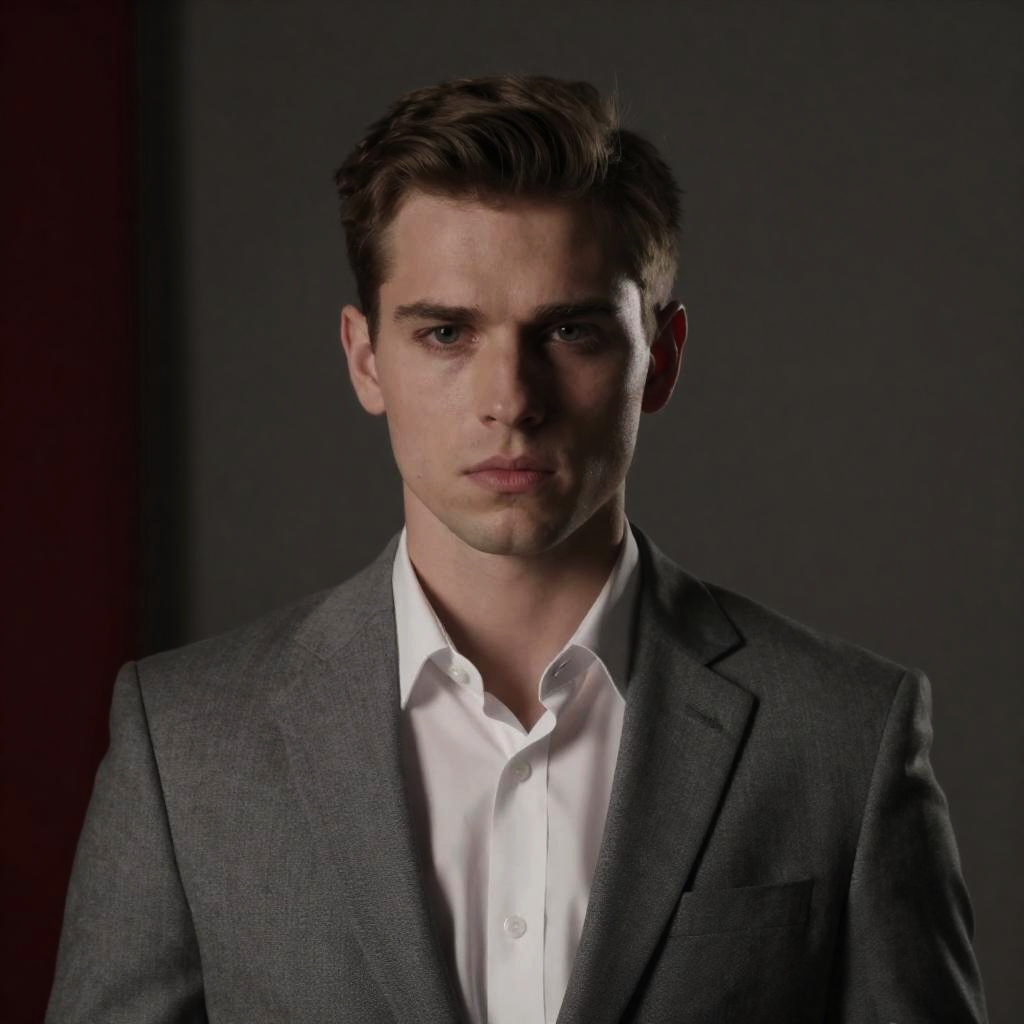 Photograph of a young Caucasian man with short, neatly styled brown hair and a serious expression. He wears a gray suit and white shirt. Dimly lit background with a shadowed wall and red light source on the left. Man's face is partially illuminated, highlighting his focused gaze.
