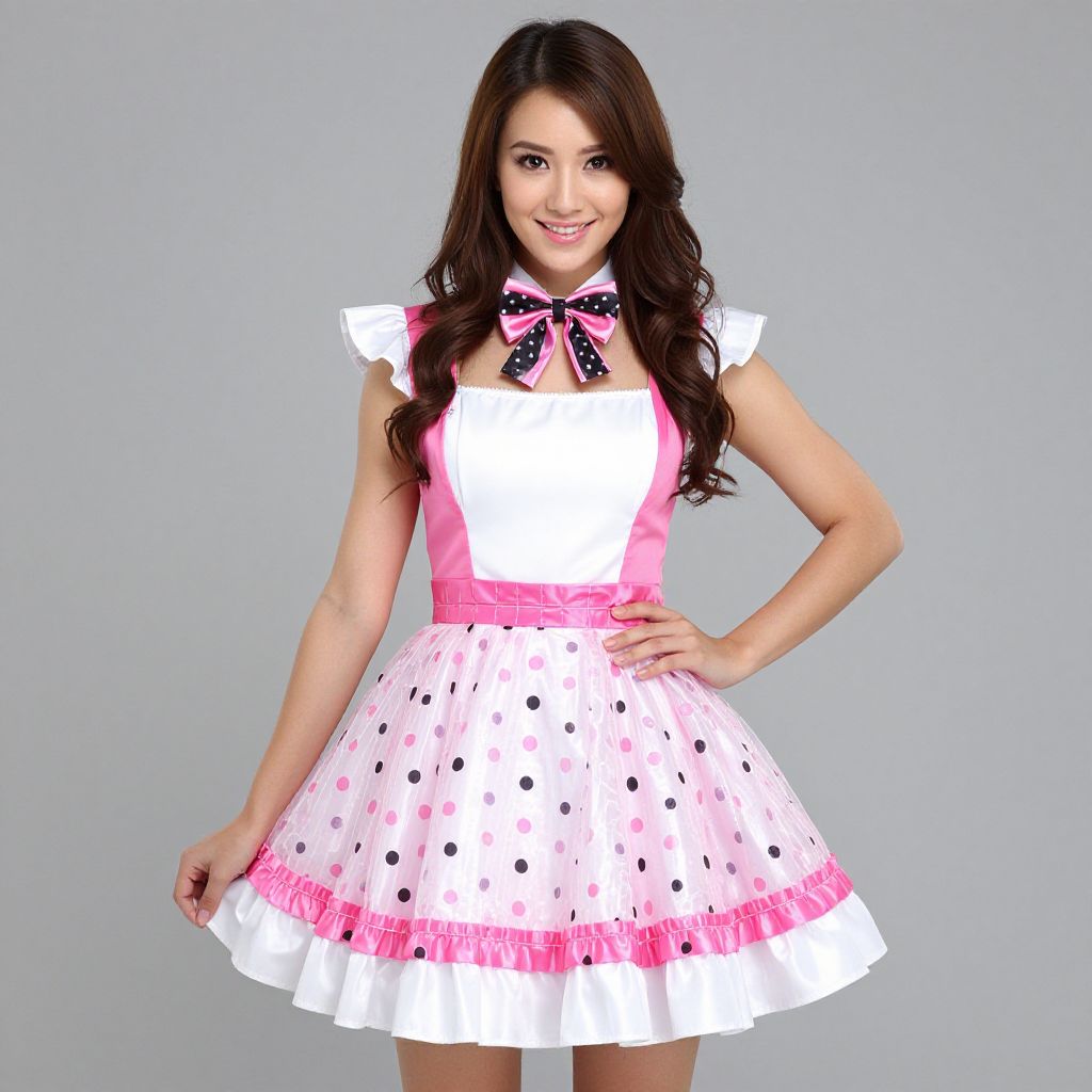 "Woman Deluxe Munchkin Costume, dressed in a pink and white polka dot dress and bow tie"