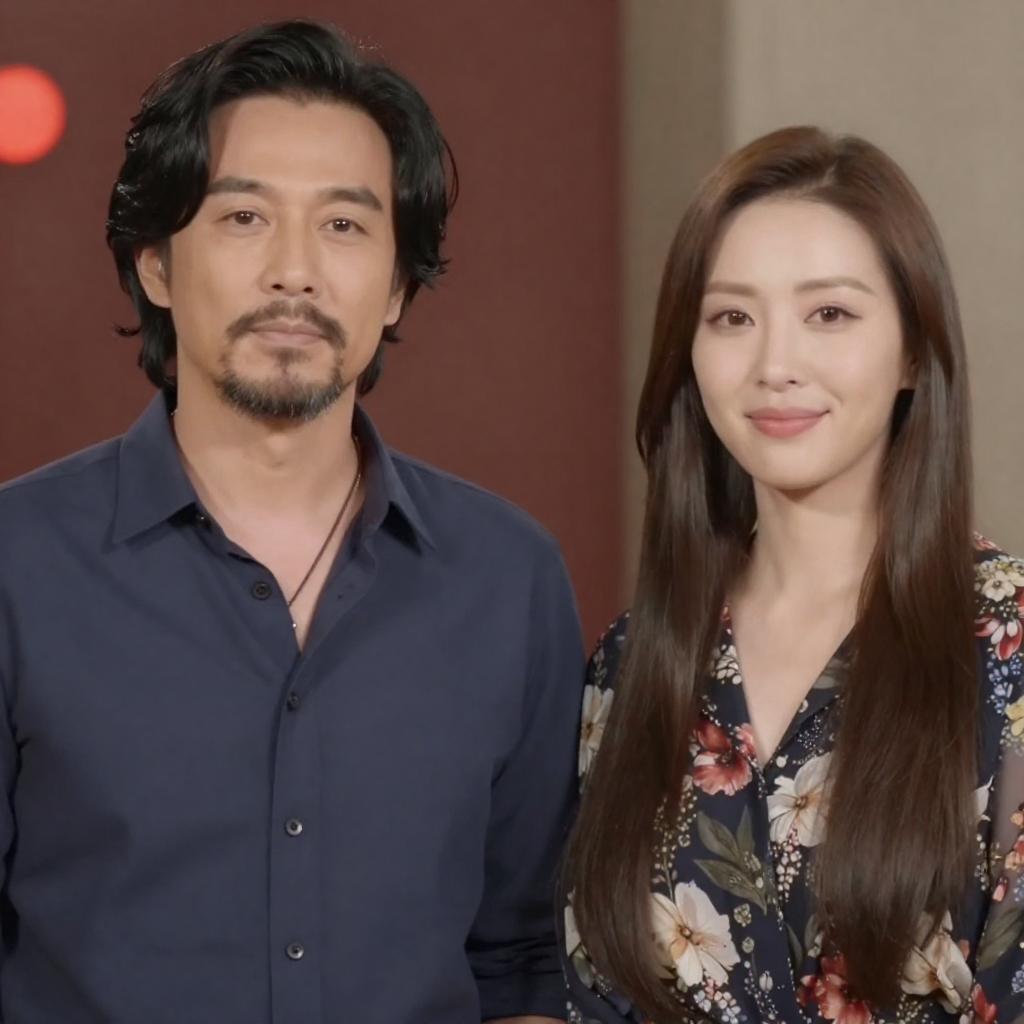 Photograph of two people in a cave. Woman with black leather jacket, purple pants, and long brown hair. Man with black leather jacket, red shirt, and black hair. Both looking forward, intense expressions. Rock wall background. Man on right slightly leaning forward.