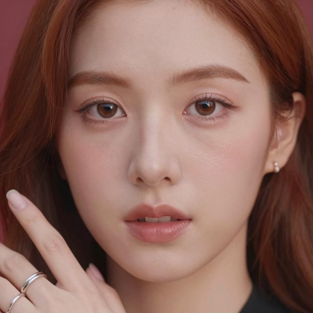 Close-up photograph of a woman with light skin and red hair, brown eyes, and slightly parted lips. She has faint freckles and subtle makeup. Her right hand, with silver rings, is raised near her face. Background is blurred red.