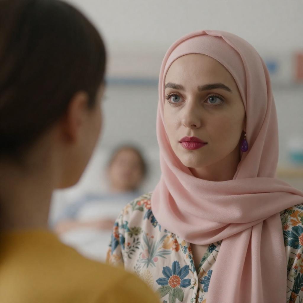 Photograph of a man in a dark hoodie embracing a woman in a beige hijab and black headscarf. Both eyes closed, leaning into each other. Background includes urban setting, trees, people, and parked cars. Another person in blue shirt standing in background.