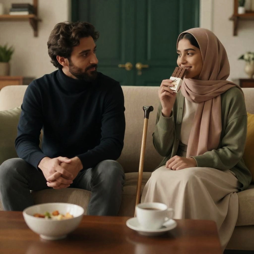 Photograph of a young couple embracing outdoors in an urban environment. The man is wearing a dark navy hoodie, while the woman is dressed in a beige outfit with a black hijab. Both have their eyes closed, expressing a moment of tenderness and affection. The background includes blurred pedestrians, greenery, parked cars, and buildings.