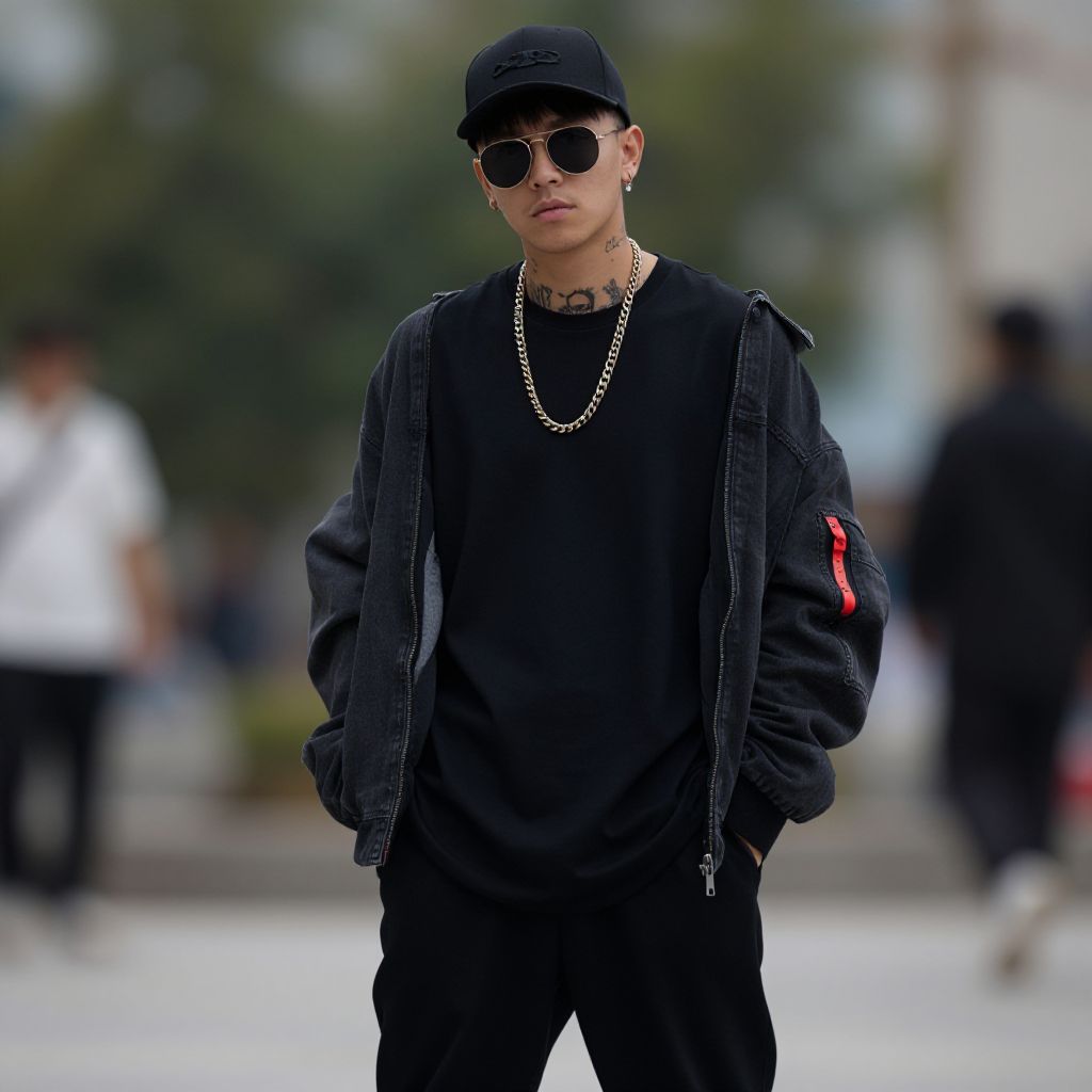 Photograph of a heavily tattooed man with pale skin, wearing a black Adidas cap and sleeveless black Adidas t-shirt. His hands, covered in intricate black and white tattoos, cover his face, partially obscuring his eyes. He has multiple rings on his fingers and wears a chain necklace. The dark, smoky background contrasts with his illuminated tattooed arms. His expression is hidden, adding a mysterious vibe. The Adidas logo is prominently displayed on his shirt and cap. The overall style is edgy and modern.