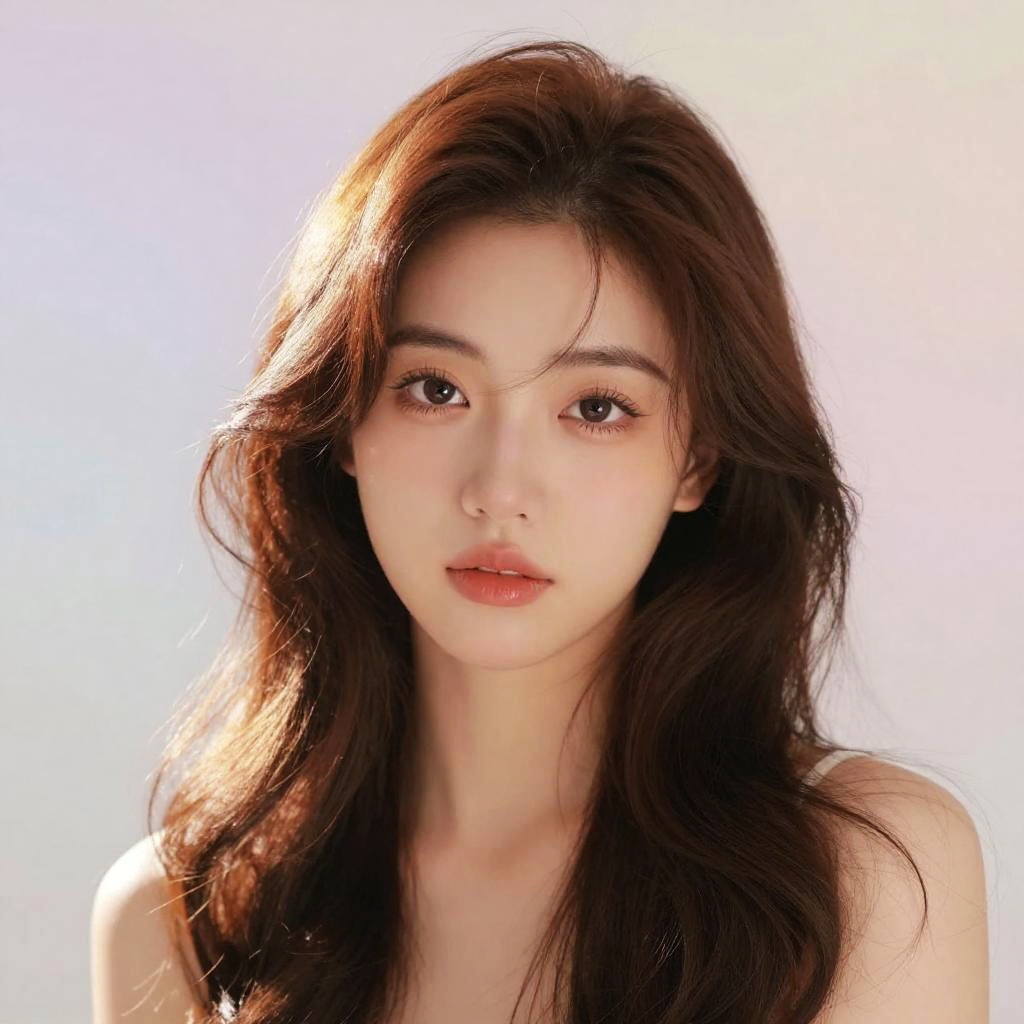 Photograph of an East Asian woman with long, dark brown hair and fair skin. She has large, dark brown eyes and full lips with a neutral expression. She wears a white, spaghetti-strap top and holds a single, white rose in her right hand, positioned near her face. The background is a plain, light gray, making her the focal point. Her makeup is minimal, emphasizing her natural beauty. The image has a soft, slightly overexposed quality, with gentle highlights and shadows. The rose is in sharp focus, contrasting with the slightly blurred background.