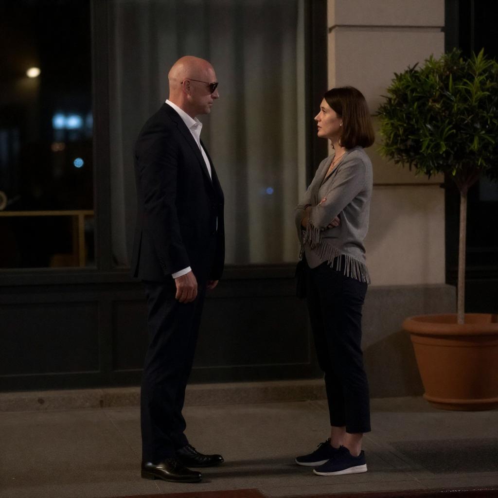 Photograph of a nighttime street scene. A bald man in a long black coat embraces a woman with shoulder-length brown hair, wearing a dark dress and black high heels. They stand on a sidewalk, illuminated by streetlights, with a blurred background of cars and a building. A man in a gray coat walks by in the background.