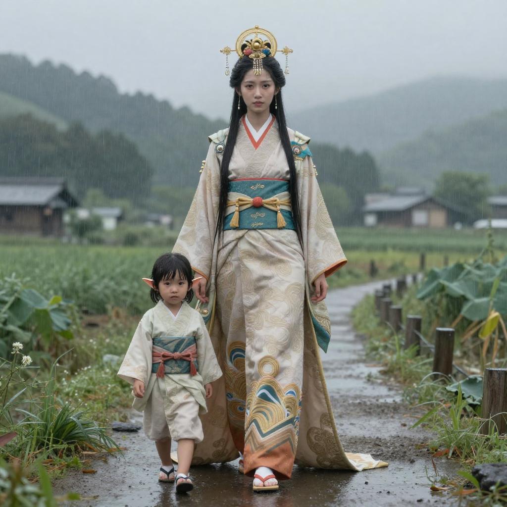 Estilovintedois, (extremely detailed CG unity 8k wallpaper), (masterpiece), (best quality), (realistic), (((bestя┐╜quality))), ((ultra-detailed)), rural Japan, Japan, summer, rain, sharp, rule of thirds, elven empress, asian empress, long hair, headdress, (child), (kid), elf, pointy ears, solo, intricate traditional japanese dress, looking at viewer, fullbody