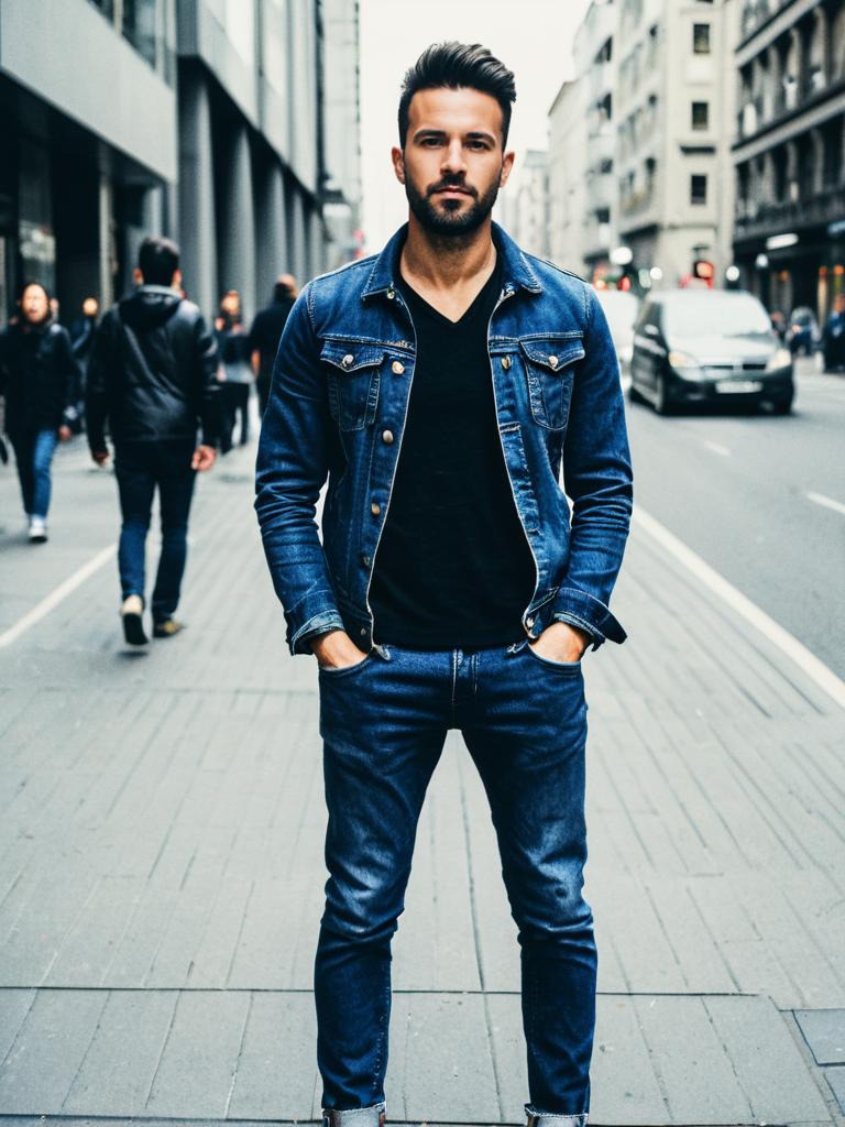 Photograph of a handsome bearded man with dark hair, wearing a denim jacket and jeans, standing on a city street with blurred background pedestrians and buildings