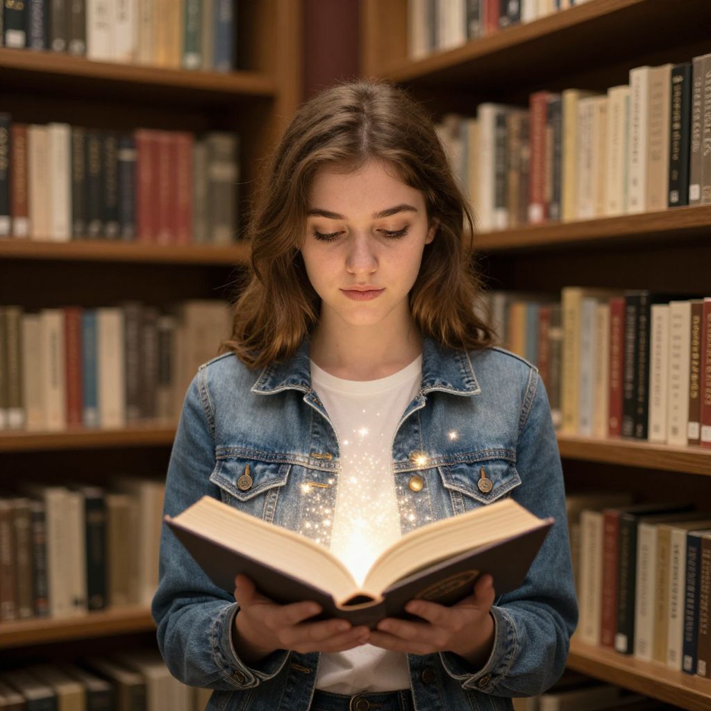 Photograph of a young woman with brown hair, wearing a denim jacket and white shirt, reading a glowing book in a library. Shelves filled with