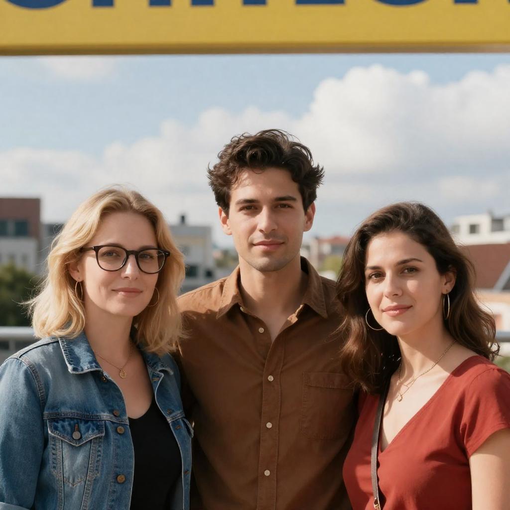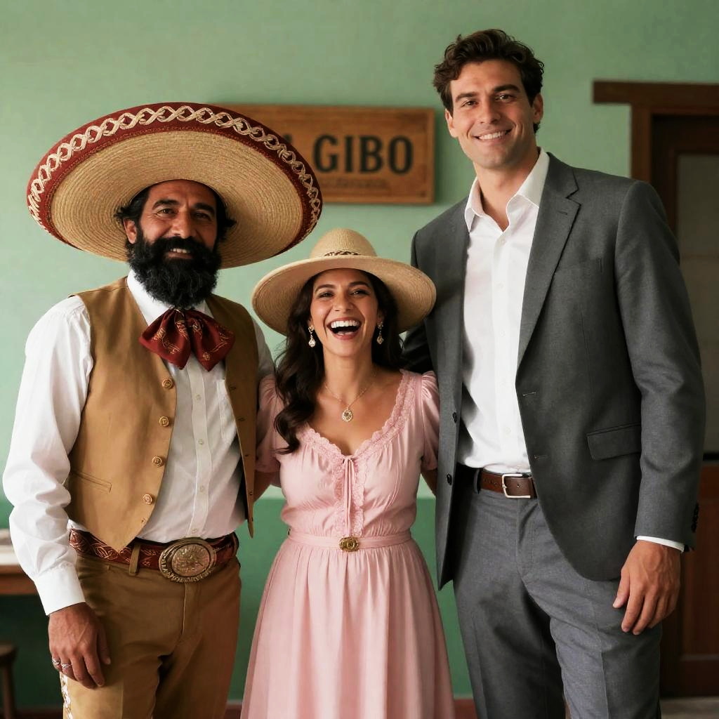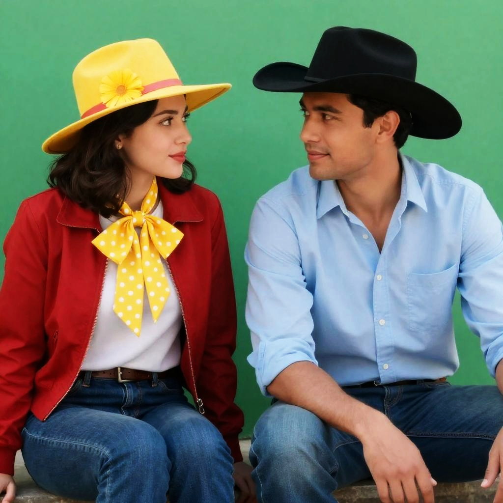 Photograph of a man and woman standing in front of a carnival background, seen through a circular hole. The man, wearing a black cowboy hat and green shirt, holds a red object. The woman, with brown hair, wears a white blouse and blue jeans. A person in a red shirt and hat is partially visible in the background. Brightly colored balloons and a wooden structure are visible. Both subjects smile. Two arms with striped sleeves are in the foreground.