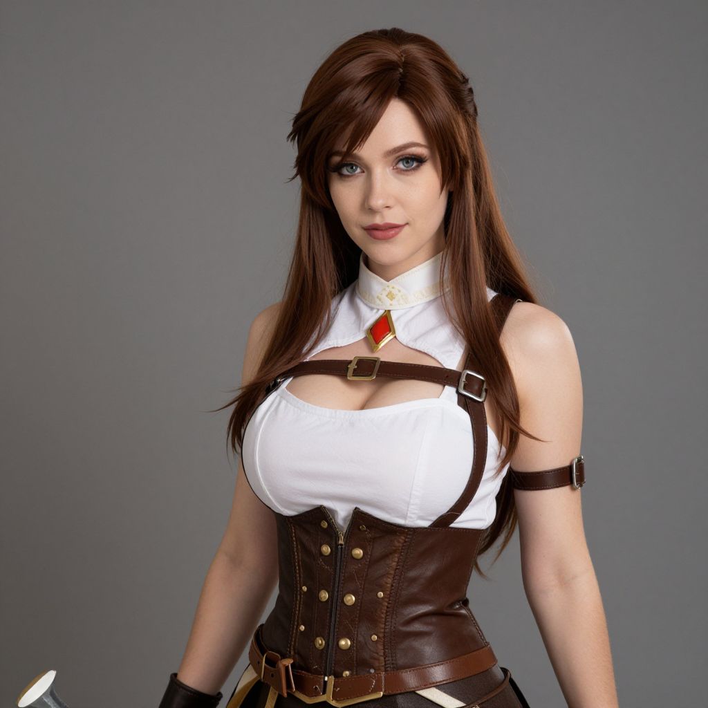 Sexy cosplay woman character wearing Enya Geil costume. Realistic photo. Jane Doe dressed as Enya Geil. Realistic photo, caucasian woman, pretty cute face, very big breasts