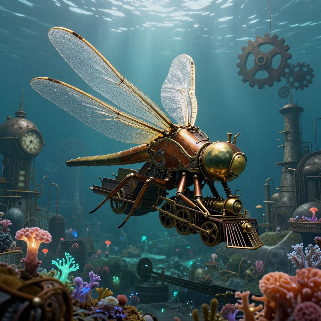 Craft an image showcasing a dreamlike underwater realm reminiscent of surrealist masterpieces, featuring a majestic mechanical creature resembling both a dragonfly and vintage steam locomotive elegantly gliding amidst a submerged industrial landscape. This captivating hybrid, adorned with gleaming brass and polished mahogany, moves with the grace of its insect form while powered by rhythmic pistons, traversing an ethereal seascape dotted with abandoned factories, clock-like structures, and floating gears bathed in the soft glow of bioluminescent flora. This enchanting blend of nature's beauty and industrial charm is illuminated by the gentle, otherworldly light cast by phosphorescent coral, inviting viewers to immerse themselves in a surreal realm where the boundaries between reality and fantasy dissolve.