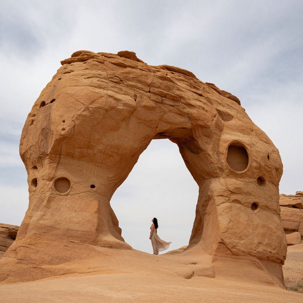Enormous, honey-colored sandstone formations with multiple circular openings stand majestically in the desert, as a woman in a flowing dress gazes upward, her silhouette framed by the vast, cloud-dotted sky.
