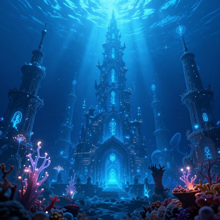 Fantasy setting generator showing a mystical underwater city, glowing coral skyscrapers inhabited by merfolk, radiant underwater plants emitting soft light, mysterious glowing symbols hovering in the water, deep blue tones with sparkling highlights, highly detailed