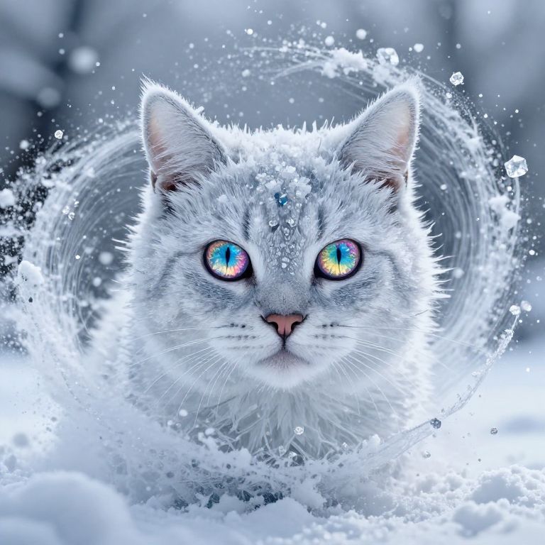 Digital art of a fluffy white cat with striking, iridescent blue and green eyes, standing in a snowy landscape. The cat's fur is covered in delicate ice crystals, and it has a small, pink nose. A magical, swirling circle of sparkling ice surrounds its head, with snowflakes floating in the background. The cat's gaze is intense and focused, creating a mesmerizing, otherworldly effect. The overall color palette is dominated by white, blue, and silver, enhancing the wintry, mystical atmosphere.