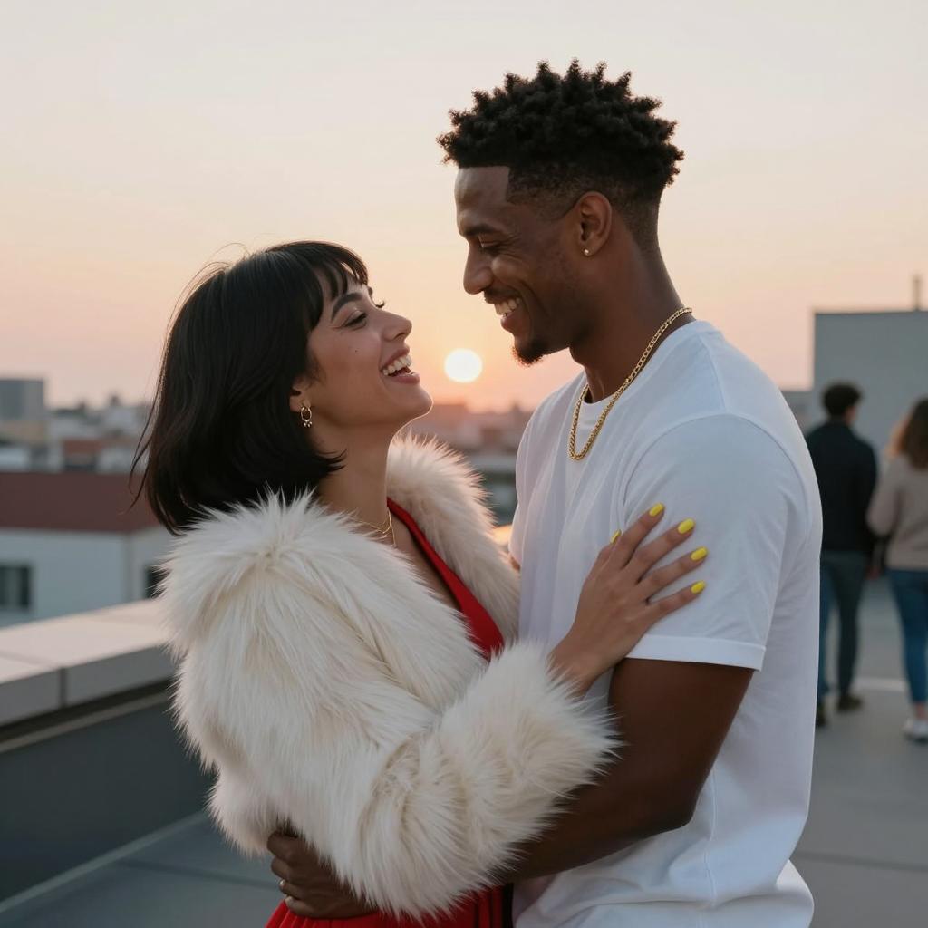 Photograph of two pairs of people. Top: close-up of two African-American individuals with dark skin, one holding a basketball above their heads, serious expressions, dark red ured background. Bottom: black-and-white illustration of a couple kissing, both with dark hair in buns, basketball hoop in background.