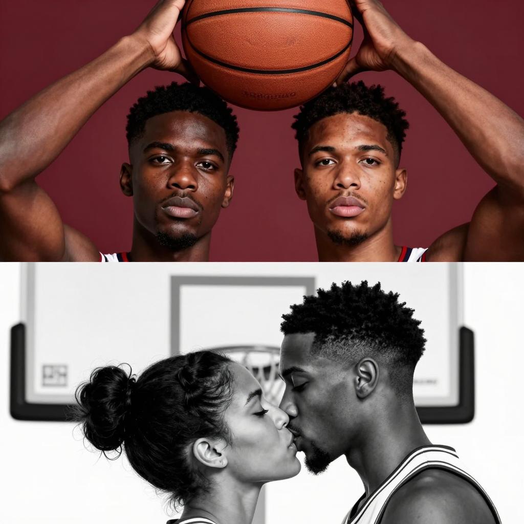 Composite image featuring two scenes: the top shows a close-up of two African-American male basketball players with serious expressions, one holding a basketball above their heads against a dark red background. The bottom is a black-and-white photo of a young couple sharing a kiss on a basketball court, with a hoop visible in the background.