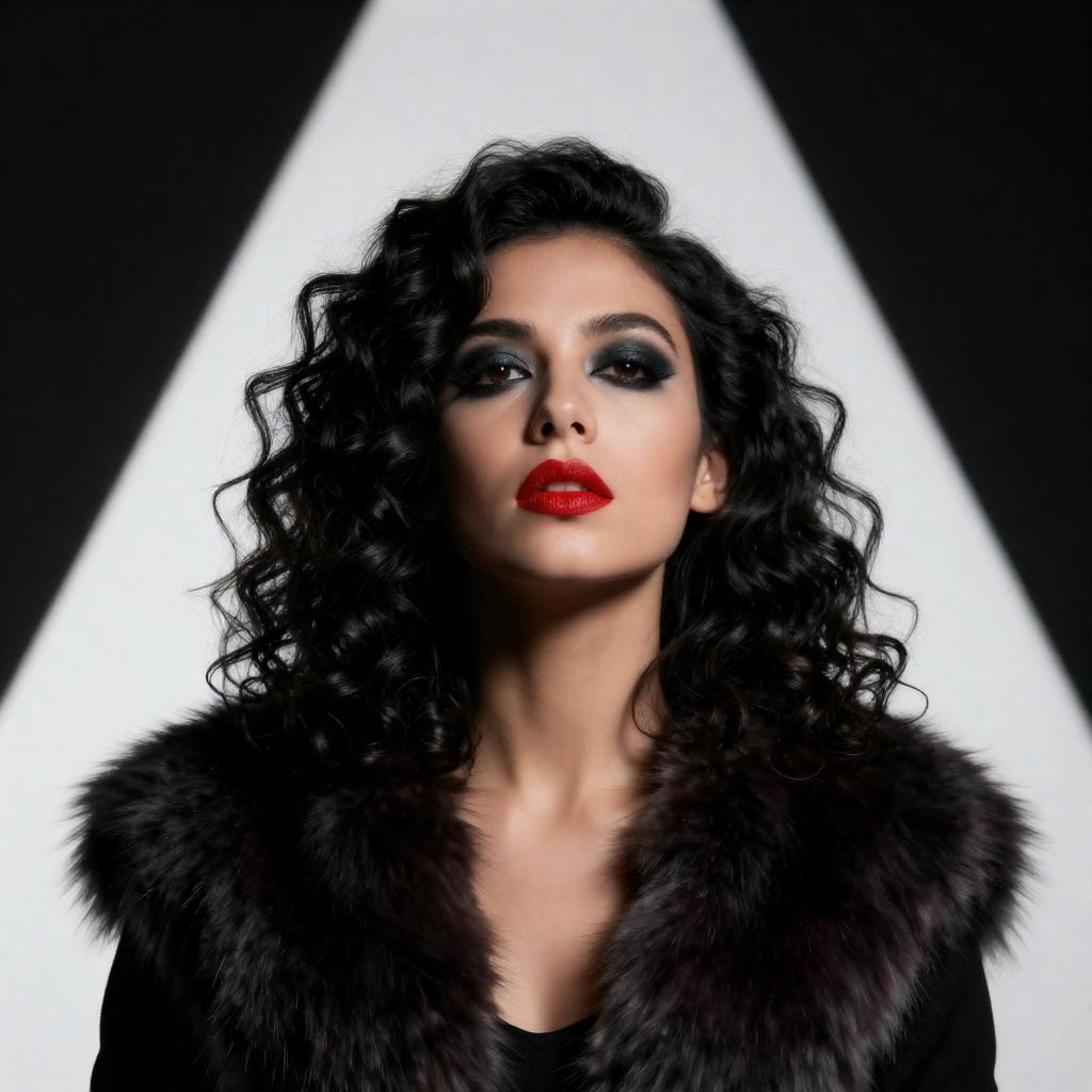 Woman with curly black hair, heavy black eye makeup, bright red lipstick, wearing dark fur collar, looking up with intense expression. Geometric white and black background. Upper body visible. Dramatic lighting.