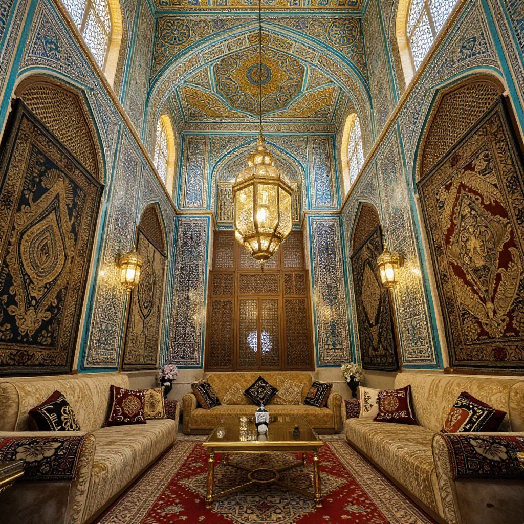 Photograph of an opulent, traditional Middle Eastern room featuring intricate blue, gold, and brown tilework on high arched walls and ceiling. A central, ornate lantern hangs from the ceiling. Two cream-colored sofas with black and gold patterned cushions flank a red and gold patterned rug. A wooden coffee table with a small vase and decorative items sits in the center. Warm, ambient light from wall sconces enhances the rich, textured patterns. The room is symmetrical, with a wooden door at the far end. The overall aesthetic is luxurious and traditional.