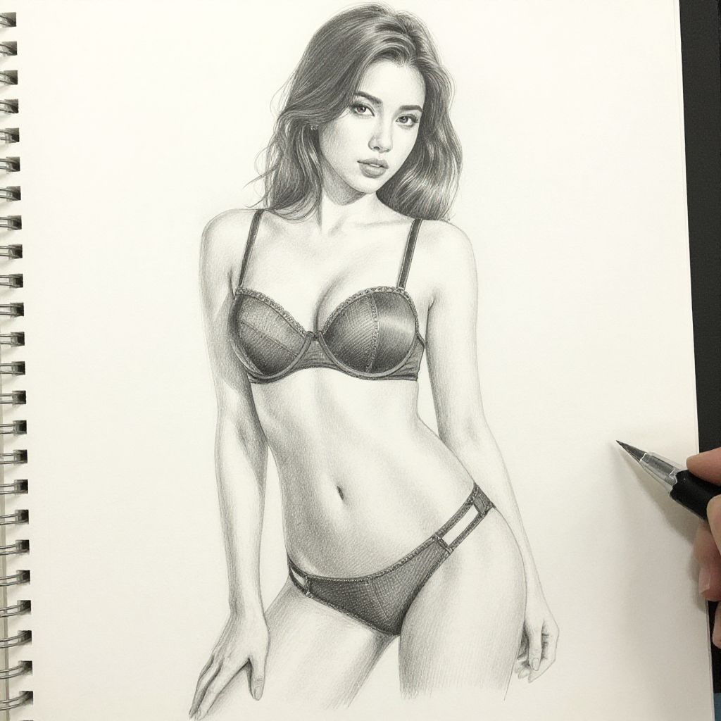 An intricate pencil drawing showcases the detailed artwork of a woman posing in lingerie, reflecting skilled sketch techniques and artistic expertise.