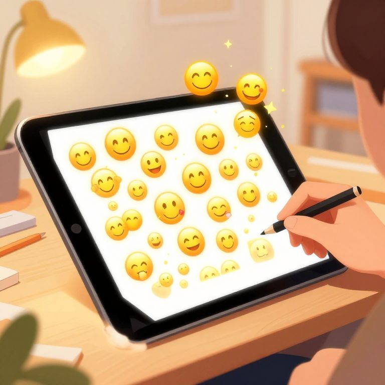 Creative emoji generator workspace with a designer using a digital tablet, bright playful emojis emerging from the screen, animated style, cozy creative studio lighting, warm colors and happy atmosphere, detailed illustration
