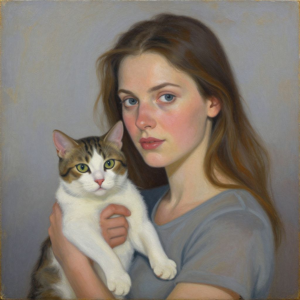This is a digital painting in a realistic style depicting a young woman with fair skin, blue eyes, and long brown hair, wearing a black top. She holds a gray and white tabby cat with green eyes and a white chest and paws close to her face. The background is a muted gray, making the subjects stand out. The woman's expression is calm and gentle, while the cat looks alert. The texture of the painting is smooth, with detailed brushstrokes that highlight the cat's fur and the woman's facial features. The overall mood is serene and intimate.