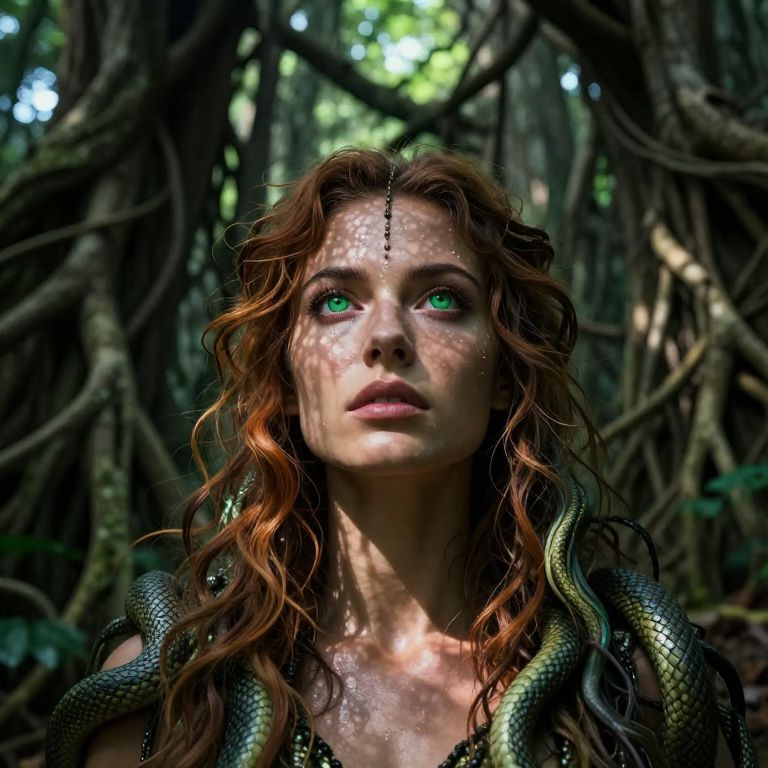 Envision an ultra-realistic portrait of a captivating blind seer with piercing emerald eyes, their gaze exuding profound wisdom and insight. From a low angle, this enigmatic figure dominates the scene with sheer presence. Nestled in an ancient forest's heart, the background showcases a hidden sanctuary of intertwining roots and vines. Dappled sunlight filters through dense foliage, casting intricate patterns on her face and vibrant hair, which appears alive, its tendrils entwined around her shoulders like living serpents. Delicate beads of perspiration glisten upon her brow as she channels the earth's energy, creating an emotional gradient from tranquility to awe and reverence. The image invites observers into a captivating world of mystery and wonder.