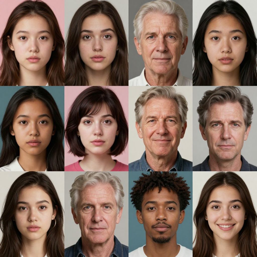 Photographic collage of twelve portraits: three women, three men, six ages 50-60+, diverse ethnicities, neutral expressions, white to pink